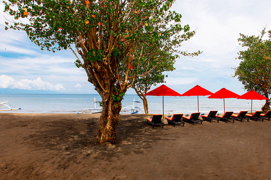 Lovina’s black sand beach in front of Bali Taman Lovina Resort & Spa is quite lovely and lend itself well to exploration on foot at a leisurely pace. The feeling on the beach is one of laid-back tranquility with small, colorfully decorated traditional outriggers called perahu dotted along the shoreline. You can swim here and the sea is very calm.